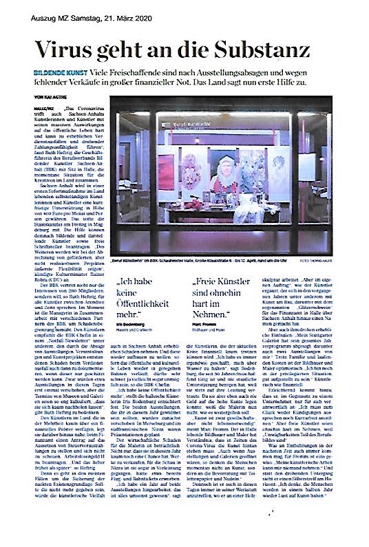 „BBKarium“-Ausstellungsreihe des BBK sachsen-Anhalt im Schaufenster der Geschäftsstelle „Beruf: Künstlerin!“ 2019, Installation und Kuratorin Grit Wendelberger
