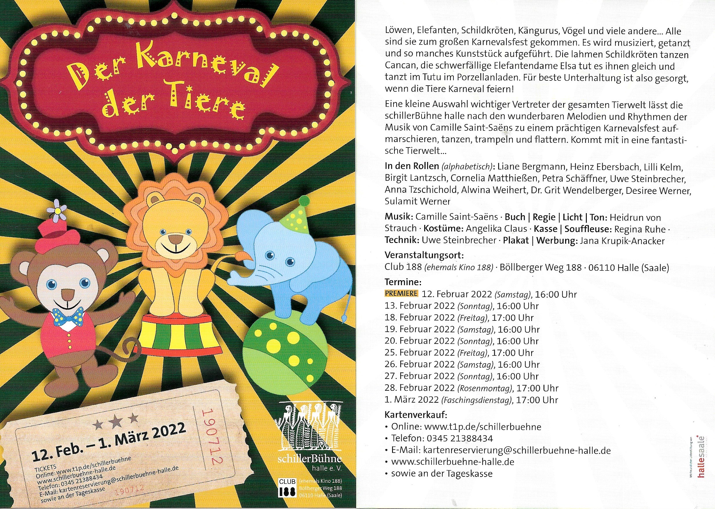 Teilnahme an der Theater-Aufführung „Karneval der Tiere“ 2021 unter Regie Heidrun von Strauch, Schauspielerin Grit Wendelberger als Zebra, Eselshintern und Dino