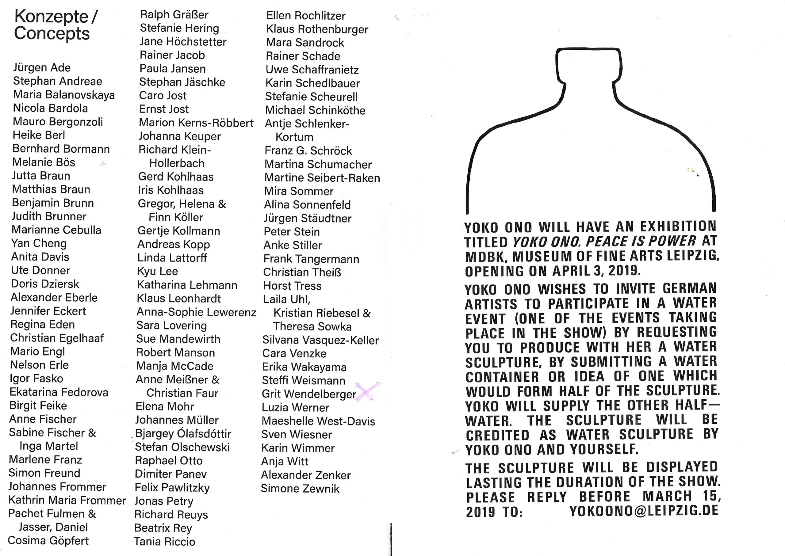 Teilnahme Grit Wendelberger an Ausstellung „Water Event“ von Yoko Ono auf deren Einladung im MfBK Leipzig, 2019