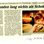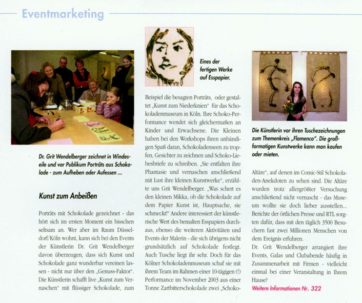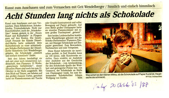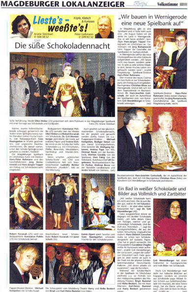 Schoko-Performance (Schokoladenbilder von Grit Wendelberger in Filmbildern) mit der Modeschule Halle und Modestudentin Nele Brand mit freundlicher Unterstützung und Plakat von Ingo Beljan (Film, Schnitt), Schoko-Ausstellung mit Kunstversteigerung, Schoko-Give-Aways “Kakaofisch”